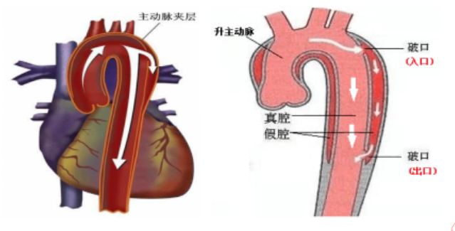 主动脉夹层(Aortic Dissection)是由于各种病因(最多见的就是高血压病、特别是没有控制的高血压)导致的主动脉壁压力增加或结构变化,主动脉腔内的血液从主动脉内膜撕裂口进入主动脉中膜,并沿主动脉长轴方向扩展,造成主动脉真假两腔分离的一种病理改变,因通常呈继发瘤样改变,故将其称为主动脉夹层动脉瘤。主动脉夹层是心血管疾病的灾难性危重急症,如不及时诊治,48小时内死亡率高达50%。