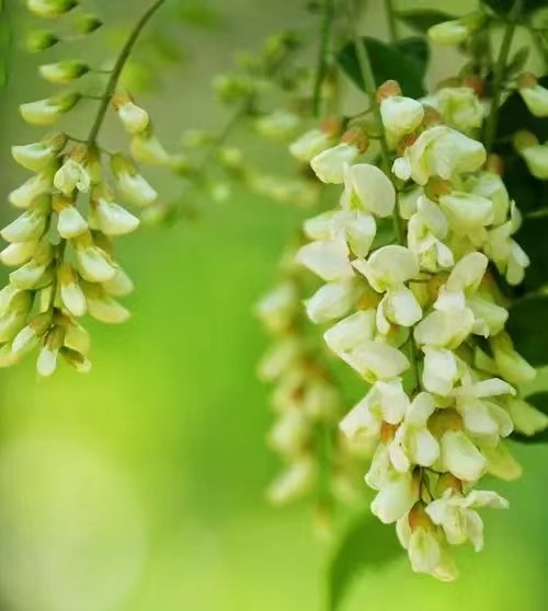 槐花就是在这样的季节开放,像一串串洁白的风铃,在阳光的缝隙中闪闪发亮,在微风的抚摸下摇曳生姿,敲响无声而又动听的乐章。