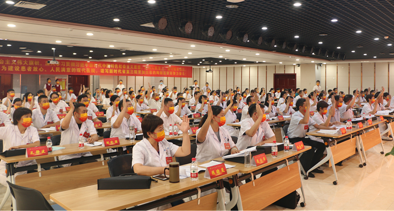大会的主题是:高举中国特色社会主义伟大旗帜,深入学习贯彻习近平新时代中国特色社会主义思想,坚持人民至上,坚守医者信念,锐意改革创新,为建设患者放心、人民满意的现代医院,谱写新时代省直三院更加出彩的绚丽篇章而努力奋斗!